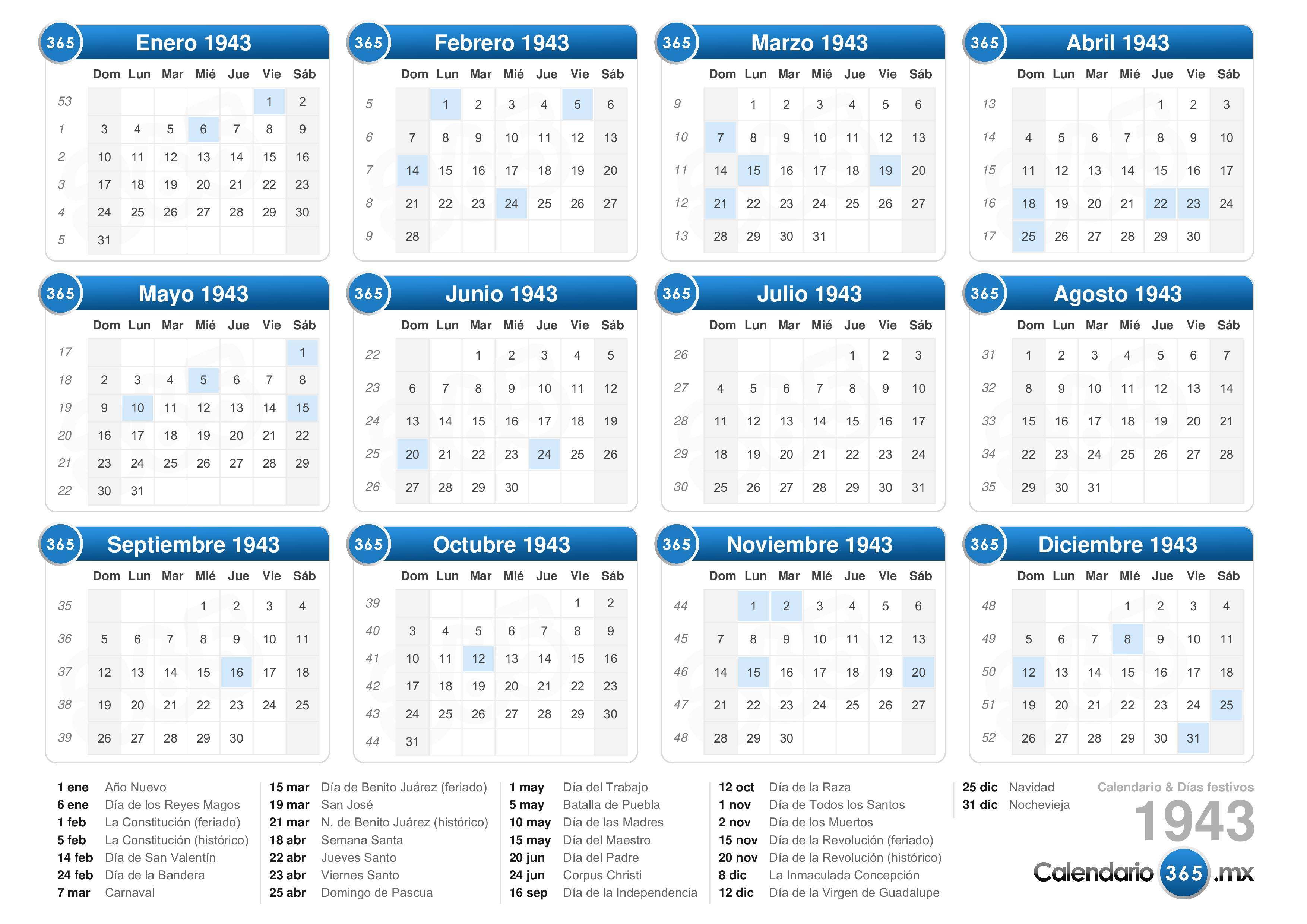 Descargue el calendario con días festivos 1943 para imprimir.
