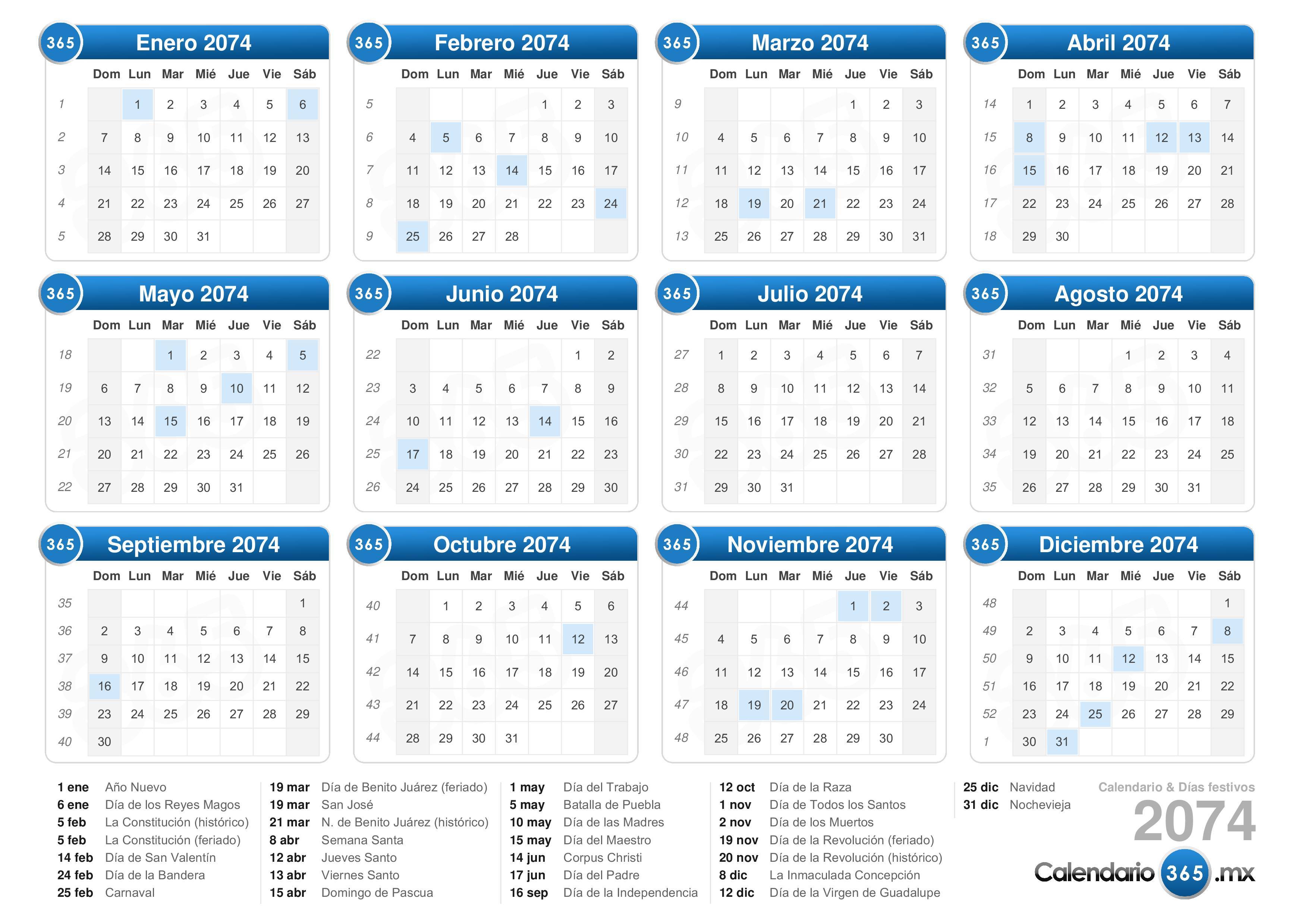 El calendario 2074 es generado automáticamente y siempre se puede ver aquí. También pueden verse los calendarios mensuales en el 2074. Estos incluyen el número de la semana. Puede verlos haciendo ‘clic’ en uno de los meses aquí arriba. A parte de esto, también se pueden ver los años bisiestos, las estaciones, el horario de verano y el de invierno, la fase de la luna actual en el 2074, el calendario lunar 2074 y las horas mundiales. Todos estos se encuentran en el menú que se encuentra en la parte superior de esta página.Consulta también Calendario 2075.