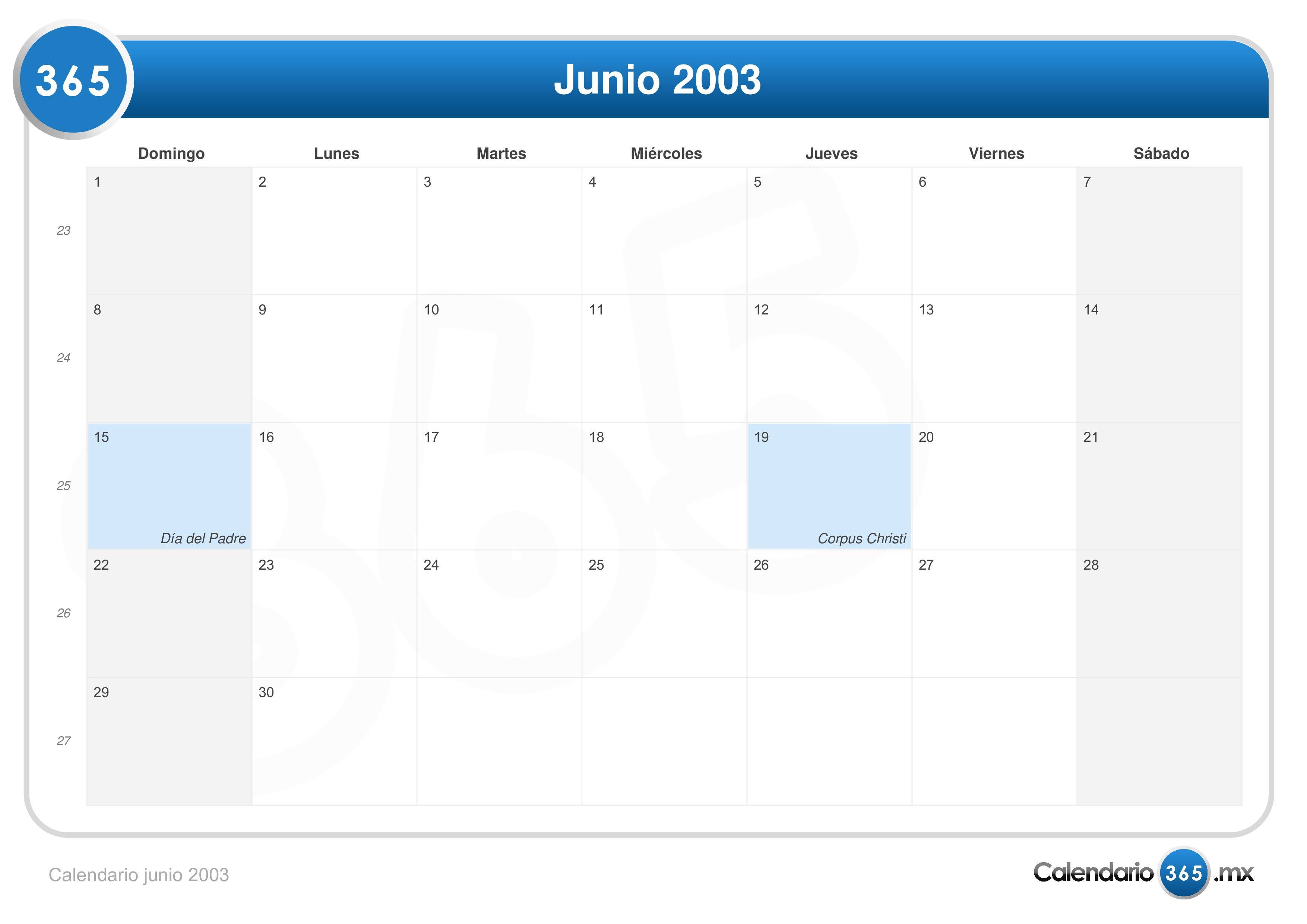 Consulta aquí el calendario mensual de junio del 2003. Este incluye los números de las semanas.| 1 junio | Día de la Marina |