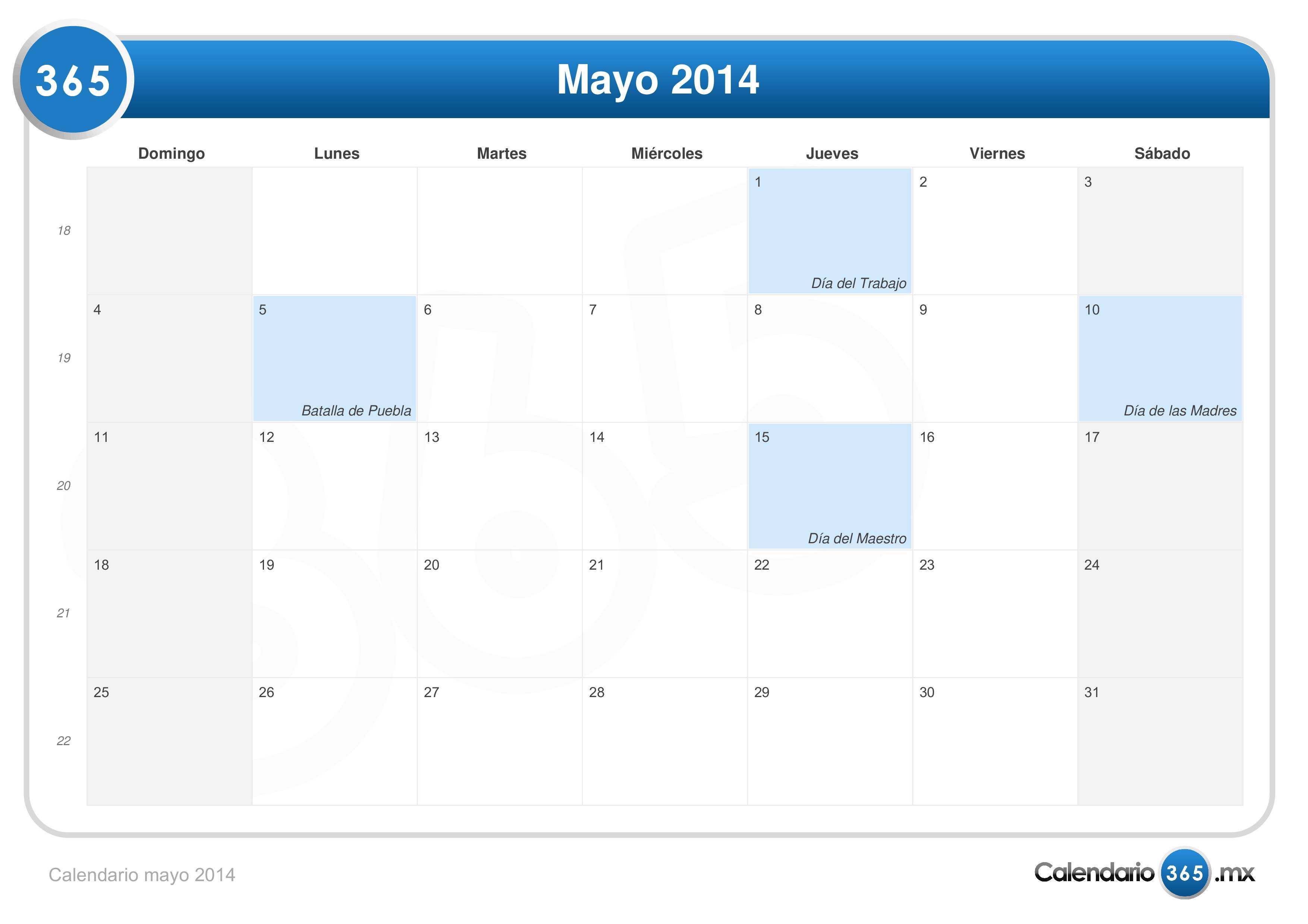 Consulta aquí el calendario mensual de mayo del 2014. Este incluye los números de las semanas.| 1 mayo | Día del Trabajo |