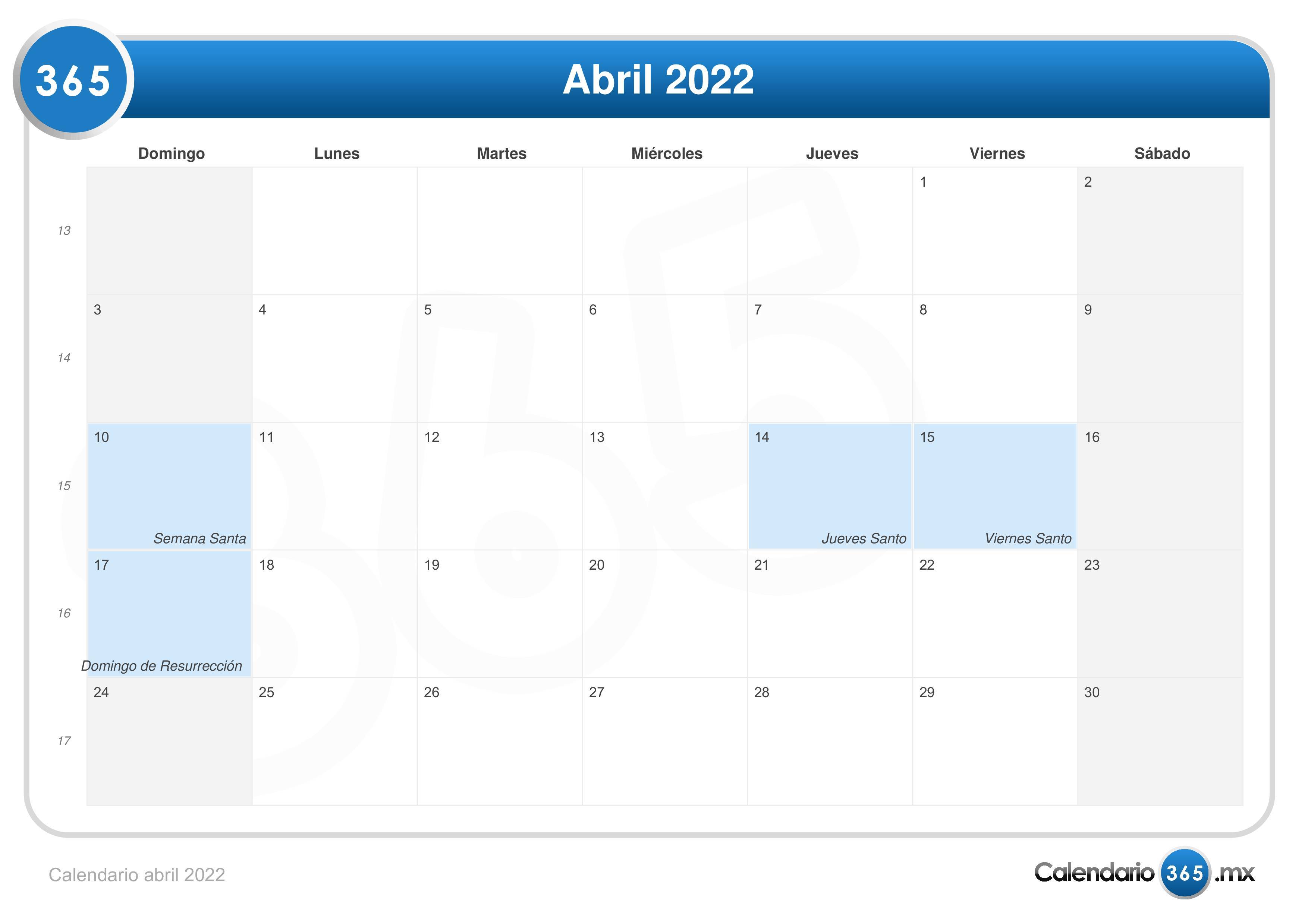 Calendario abril 2022 (Formato apaisado)Vaya al Calendario 2022.