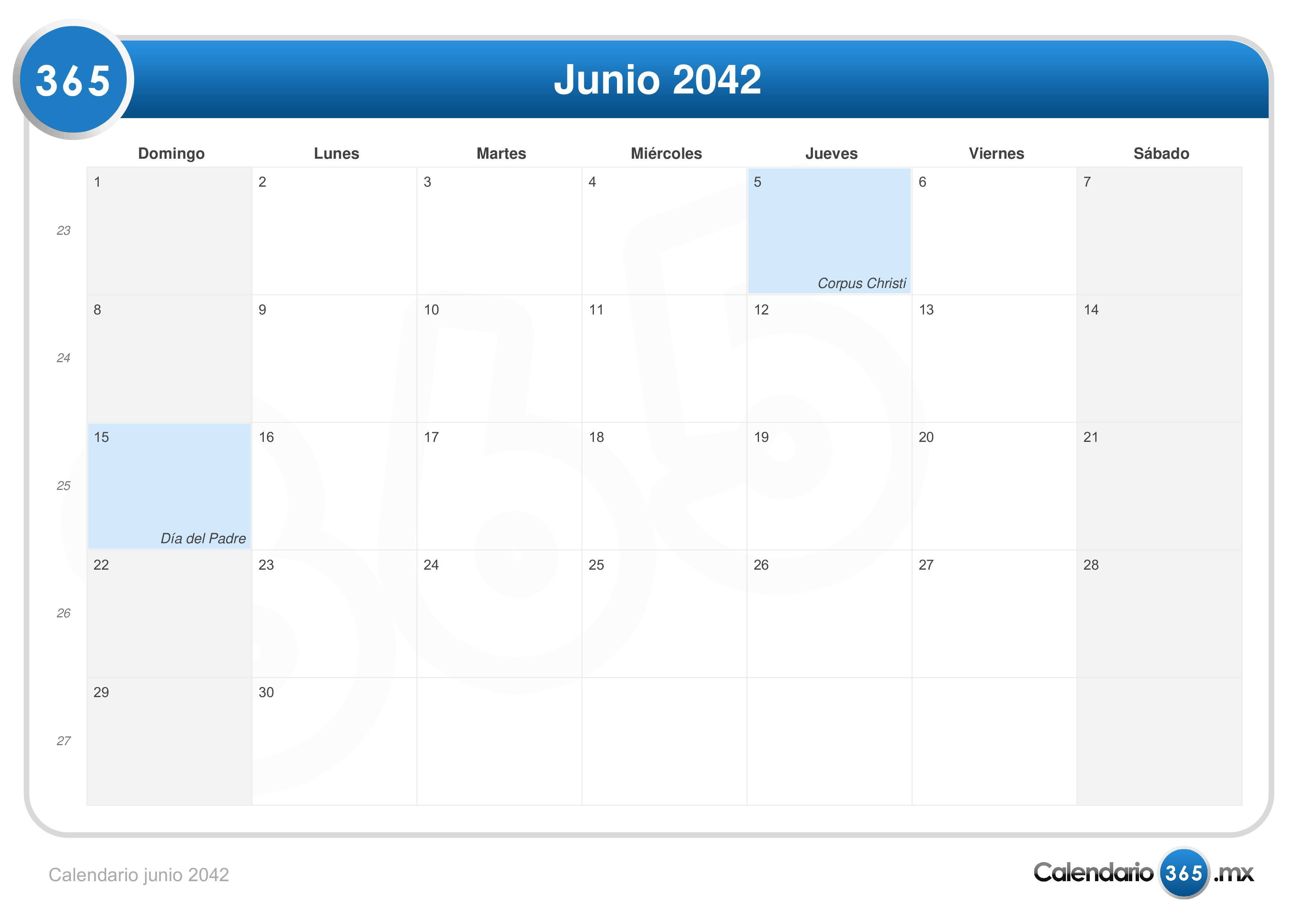 Calendario junio 2042 (Formato apaisado)Vaya al Calendario 2042.