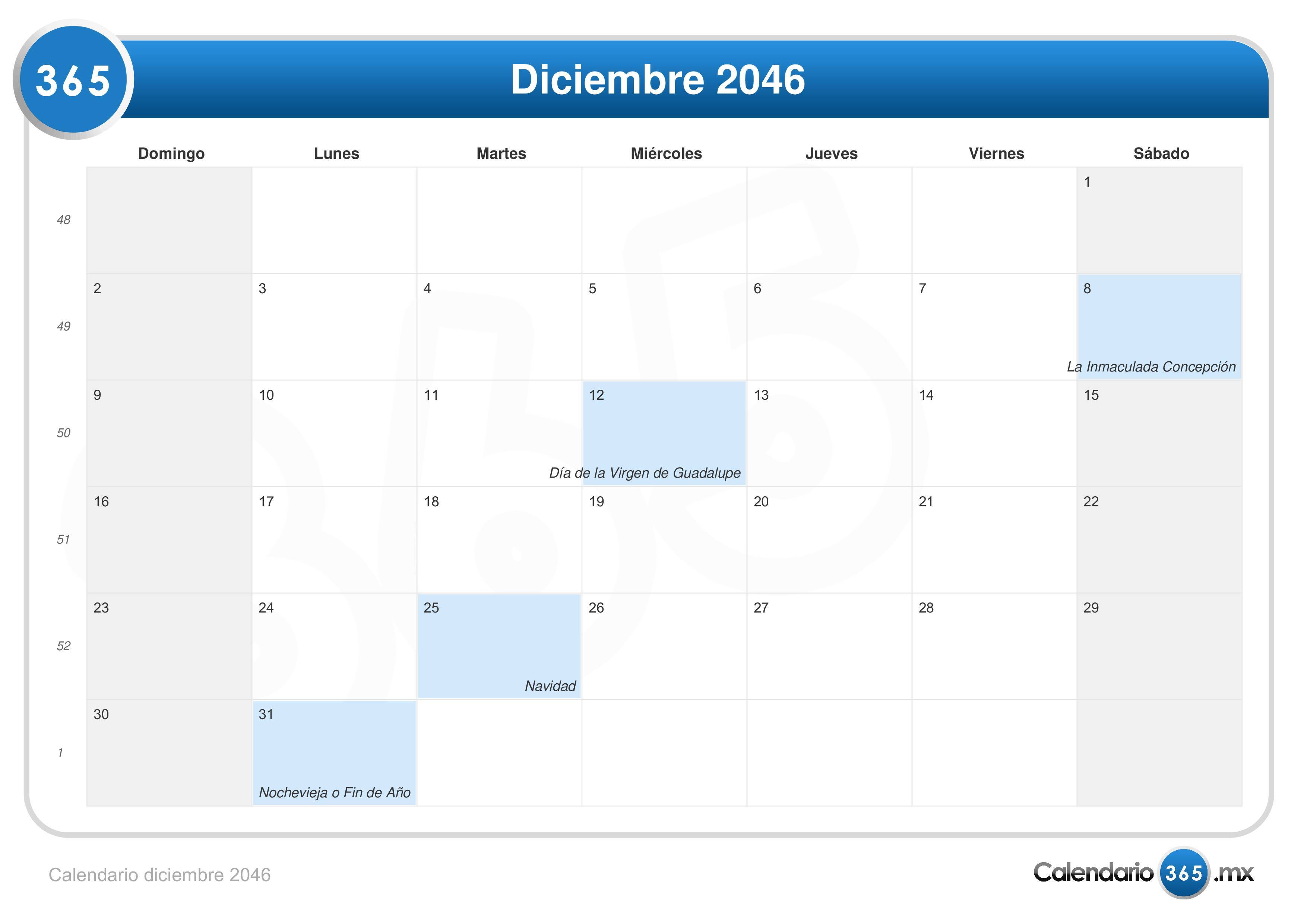 Calendario diciembre 2046 (Formato apaisado)Vaya al Calendario 2046.