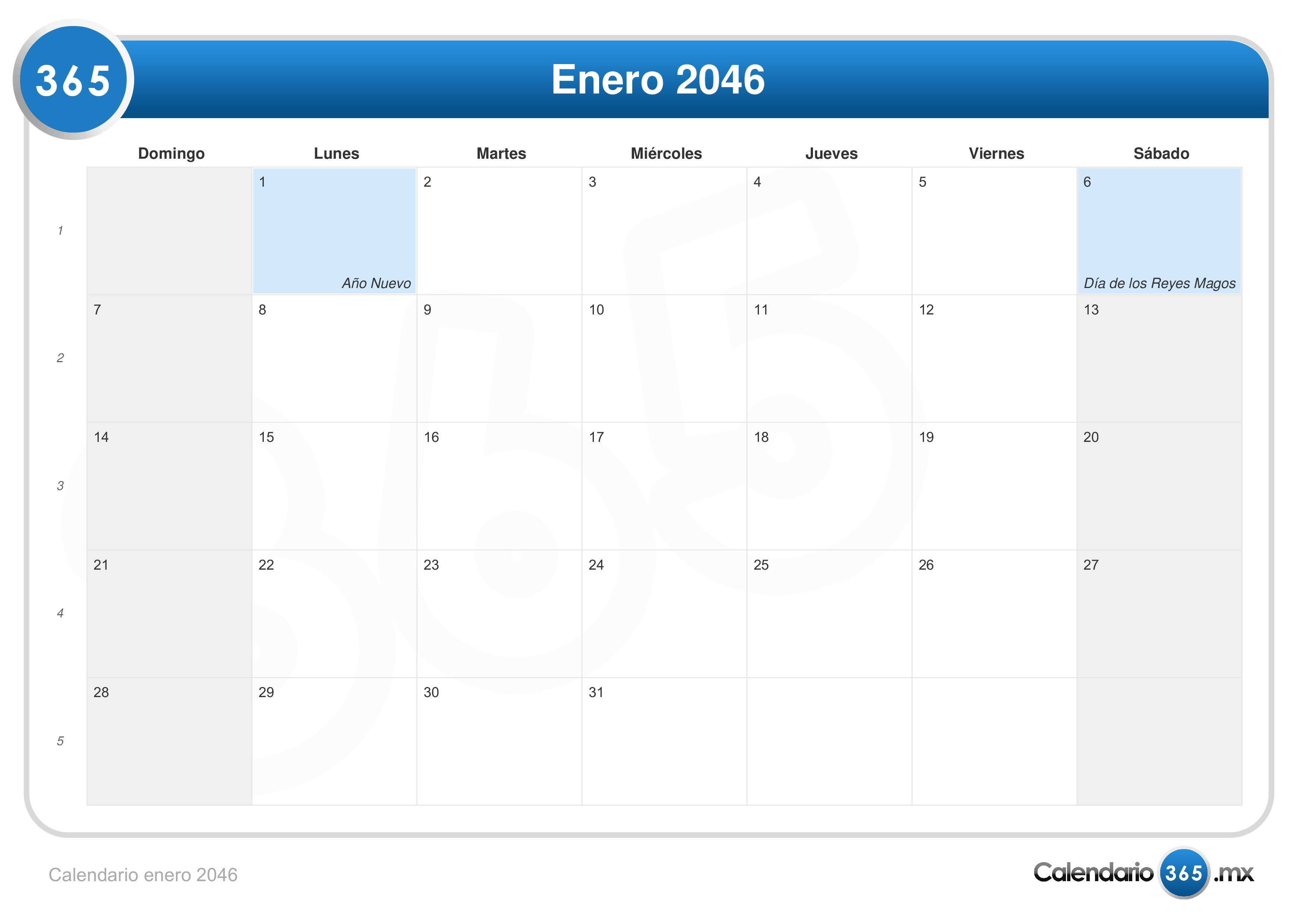 Calendario enero 2046 (Formato apaisado)Vaya al Calendario 2046.