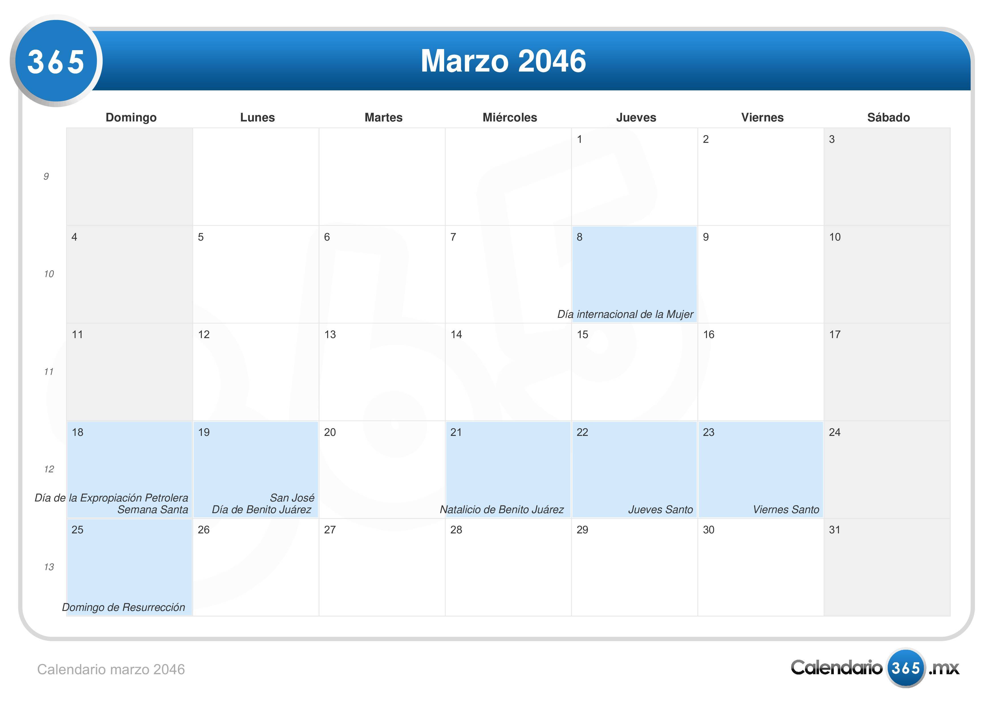 Consulta aquí el calendario mensual de marzo del 2046. Este incluye los números de las semanas.| 8 marzo | Día internacional de la Mujer |
