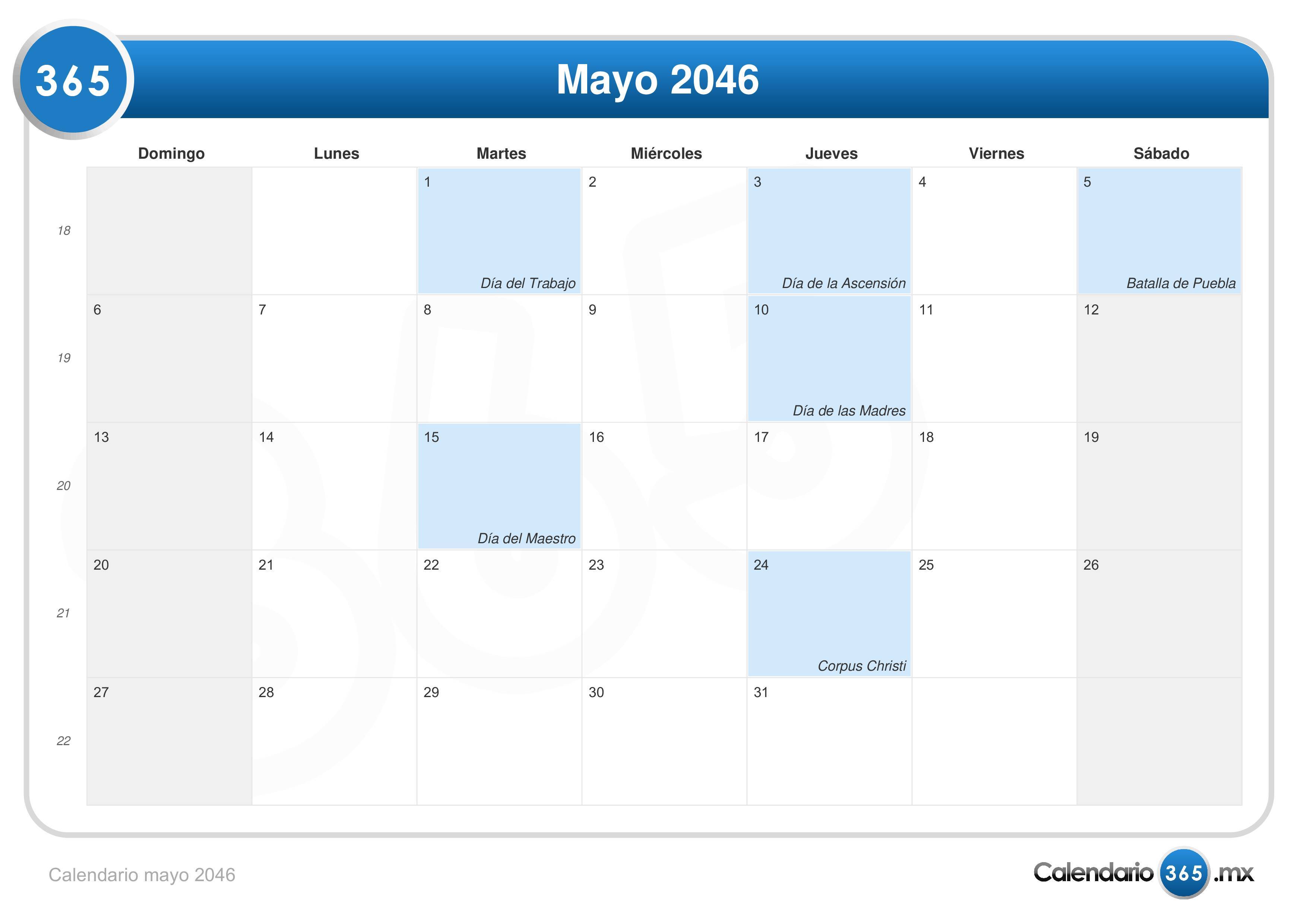 Consulta aquí el calendario mensual de mayo del 2046. Este incluye los números de las semanas.| 1 mayo | Día del Trabajo |
